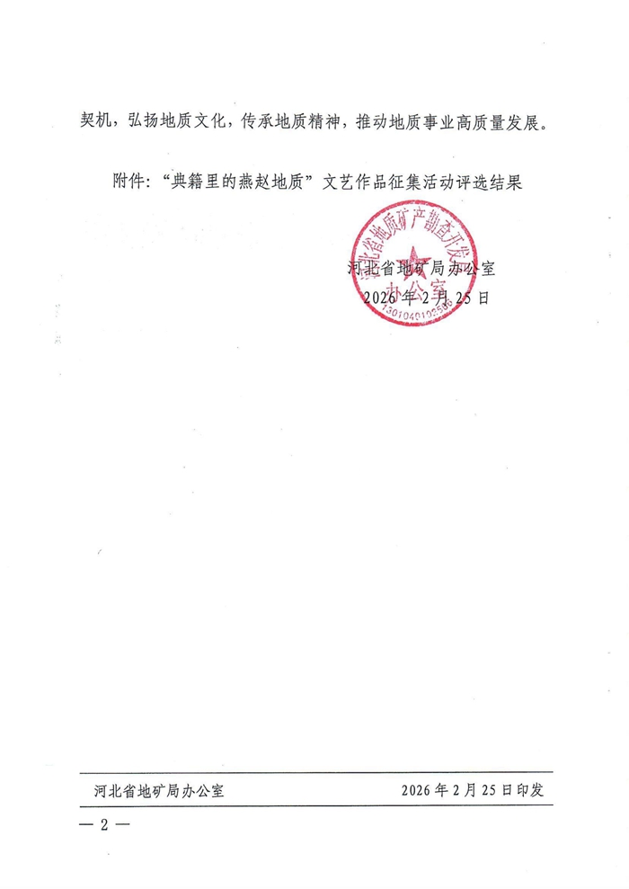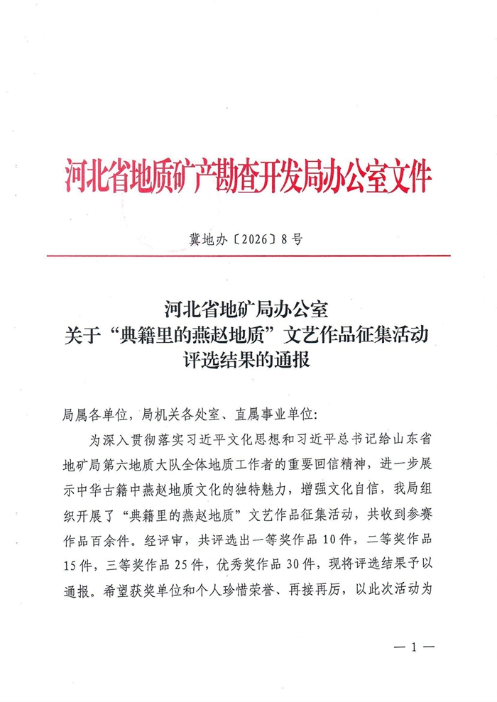 近日,河北省地矿局“典籍里的燕赵地质”文艺作品征集活动评选结果揭晓,我校教师李平作品《探典籍里的燕赵地质 看阳原儿女寻根泥河湾》及金燕作品《灿烂的笑容》获得三等奖。